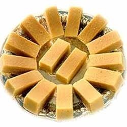 चिकनाई लगी किनारेदार थाली में जमने के लिए डाल दें। ऊपर से पिसी इलायची, कटे हुए मेवे, नारियल, बुरक दें। बिलकुल ठंडी होने पर तेज चाकू से मनचाहे आकार में बर्फी काट लें। इस स्वादिष्ट मोहन भोग से पर्व का आनंद उठाएं।