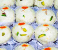 150 ग्राम सूखे खोपरे का बूरा, 200 ग्राम मिल्क मेड, एक कप गाय के दूध की फ्रेश मलाई, आधा कप गाय का दूध, इलायची पावडर, 5 छोटे चम्मच मिल्क पावडर, कुछेक लच्छे केसर।