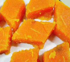 तत्पश्चात डेढ़ तार की चाशनी तैयार करें। इस चाशनी में खोपरा बूरा-मावा, मीठा पीला रंग व इलायची पावडर मिला दें तथा मिश्रण को अच्छीतरह मिक्स कर लें। अब इसमें घी मिलाएं तथा पुन: हिलाएं।
