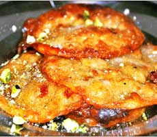 तत्पश्चात एक कड़ाही में तेल गरम करके एक कड़छी से घोल डालें और कुरकुरा होने तक तल लें। फिर चाशनी में डुबो कर एक अलग बर्तन में रखते जाएं। ऊपर से पिस्ता-बादाम की कतरन बुरका कर भोग लगाएं।